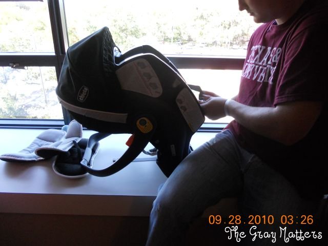 All was well, and we were out the door Tuesday afternoon! Aunt Nancy (maybe Cookie, but we’re not sure… we already have a Cookie, so we might just have two) was there, so we got some great photos of our first trip. We got ready to put Baby Gray in the carseat, and the smallest settings were much too small for our big boy! Mr. Gray had to adjust the carseat so we could safely take Baby Gray home!