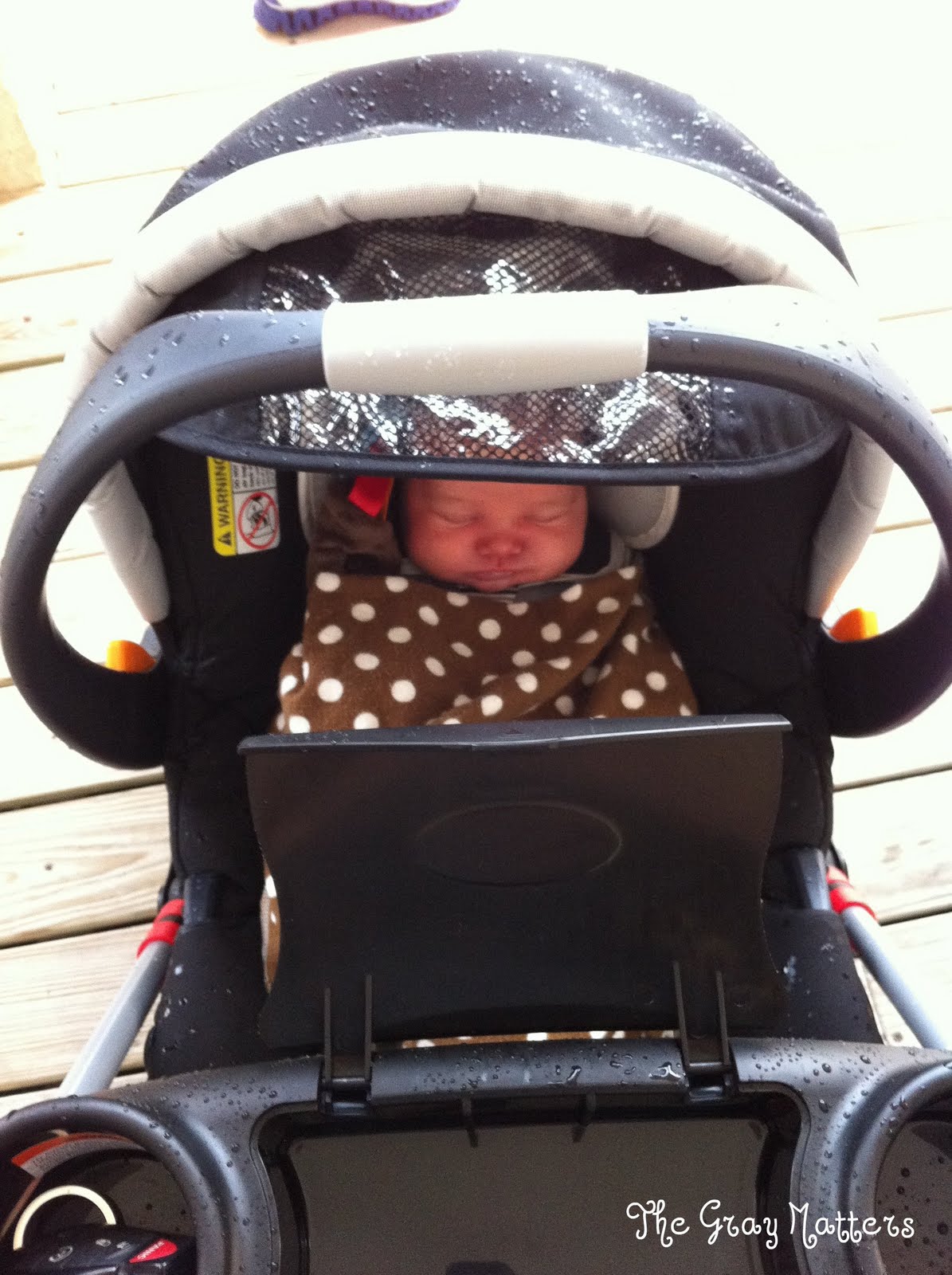 Saturday morning, Aunt B and Auntie Heather ran another half-marathon, so Baby Gray and I went to meet them at the finish line. It drizzled on and off on our way to the race, but when we got to the finish line, it was clear. As soon as they crossed, though, it started to rain. Baby Gray got to hang out in the rain for the first time. (Don’t worry, I didn’t let him get wet–no sick babies, please.)