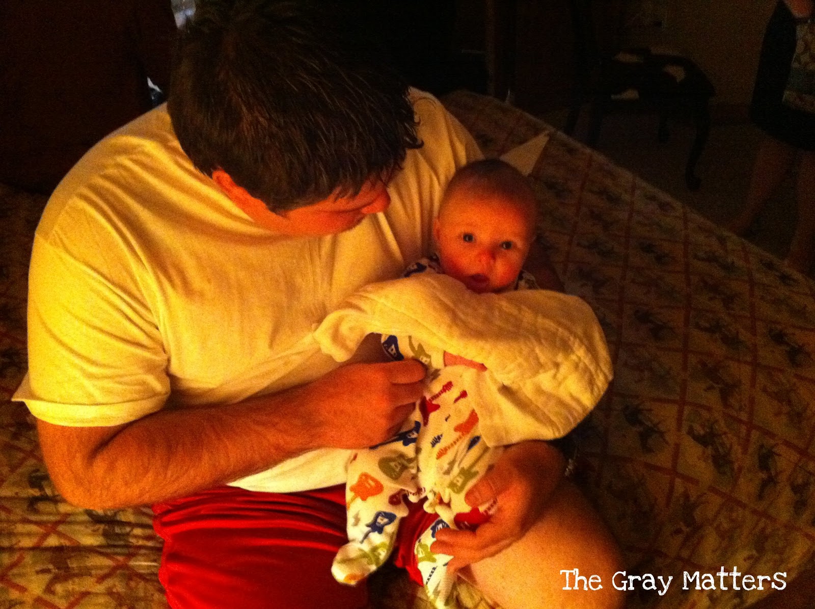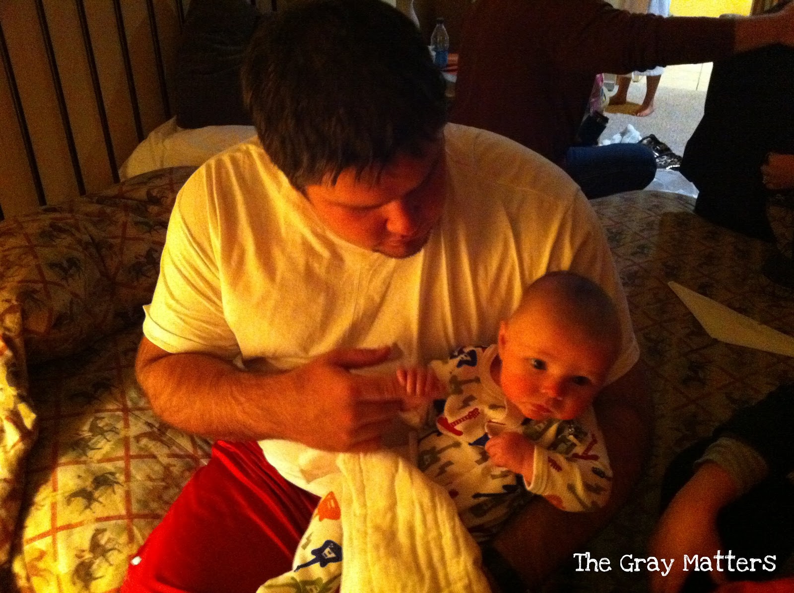 After Uncleby & Aunt B’s wedding, everyone walked back over to the villas and hung out. Unfortunately for them, a lot of us were hanging out in their room (yes, on their wedding night). We didn’t stay long, but we were there long enough that Uncleby asked to hold Baby Gray. (This is absolutely an event worthy of its own blog!)