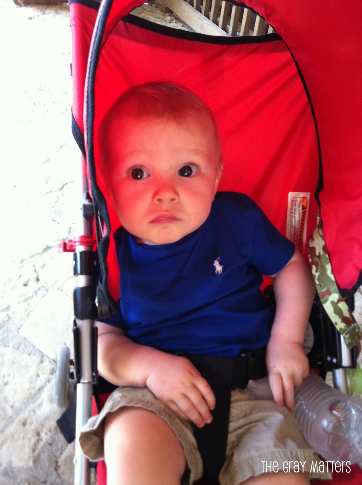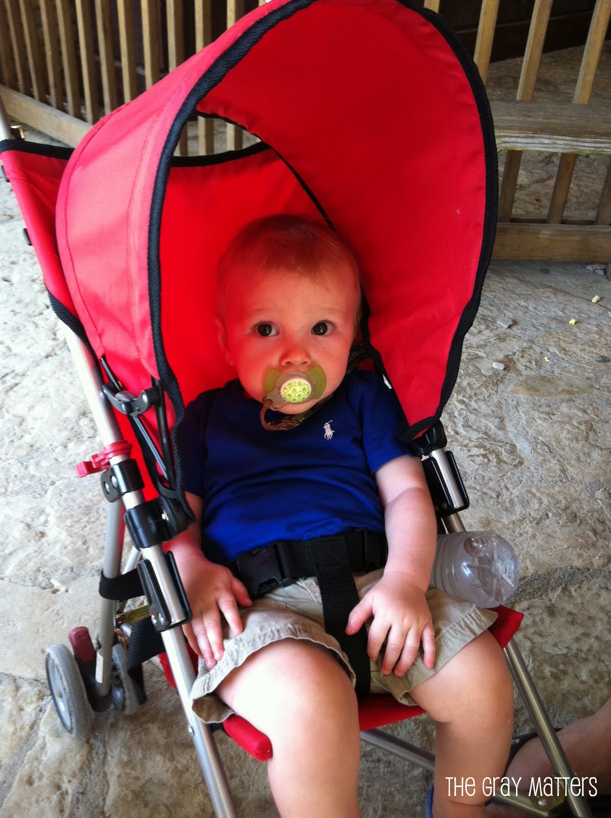 As usual, there was a little bit of a wait, but we found a shady spot with a fan to hang out. Baby Gray played in his stroller (this particular stroller, the $20 variety from Babies R Us cracks me up) and ate Cheerios to pass the time.