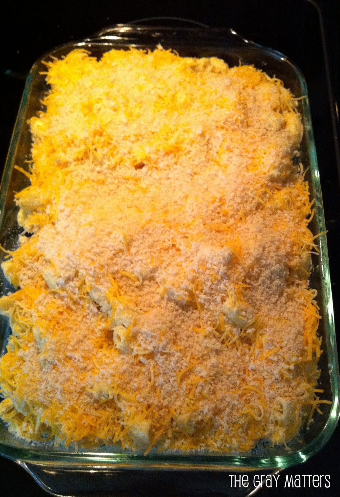 Here is my initial, layered dish. It’s got the cheesy noodles topped with Parmesan, covered in cheddar, and then sprinkled with bread crumbs. For me, the bread crumbs are the kicker. They are absolutely necessary; Pioneer Woman didn’t add them, but I’m not one to question her.