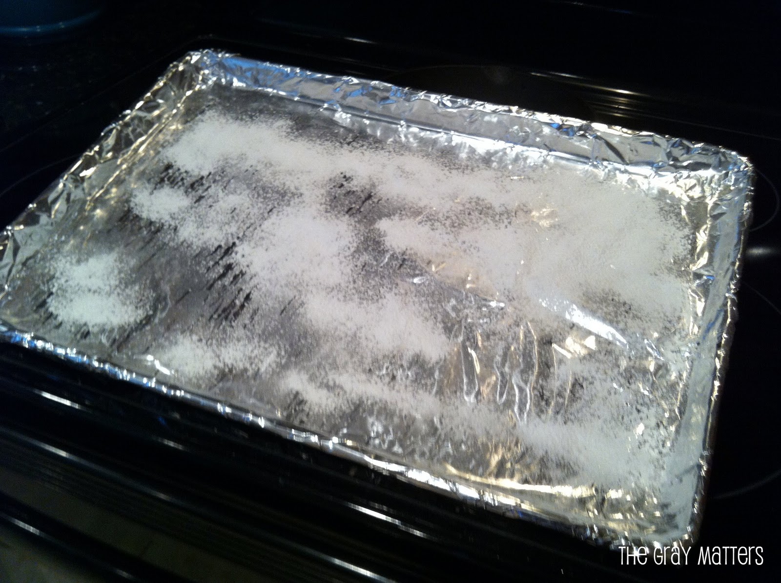 To get started, line an 11″ x 17″ pan with foil. I like to sprinkle a little powdered sugar on mine for two reasons: first, it keeps the brownies from sticking; second, it adds a little extra sticky sweet! Preheat the oven to 350 degrees.
